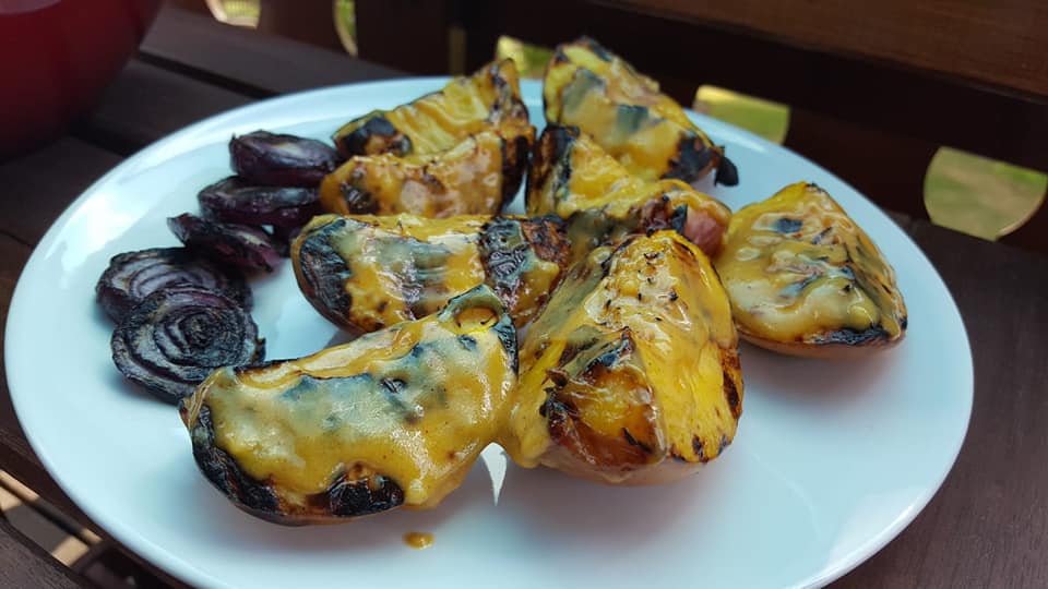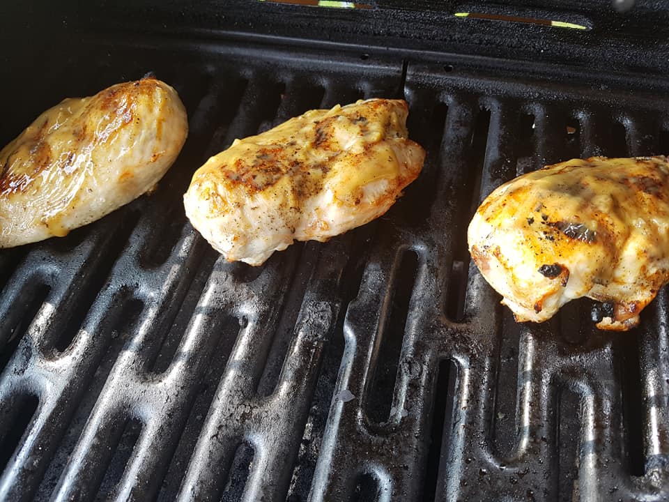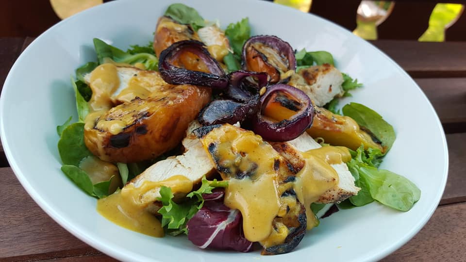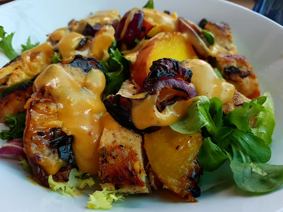Dieses Mal gab es Salat mit gegrillten Pfirsichen und Hähnchenbrust vom Grill. Verfeinert mit gegrillter Zwiebel und einer Senfmarinade.